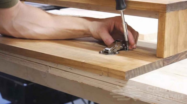 Потом останется только прикрутить мебельные петли. При этом вы можете установить их как снизу, так и сверху, в зависимости от того, в какую сторону надо, чтобы открывалась дверца полки.
