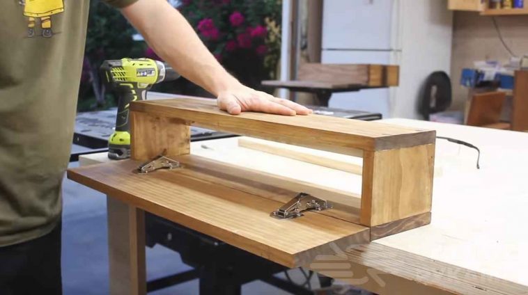 На следующем этапе необходимо будет обработать готовый короб при помощи шлифмашинки. Далее изготавливается дверца для полки. После этого автор покрывает поверхность морилкой (цвет может быть любой).