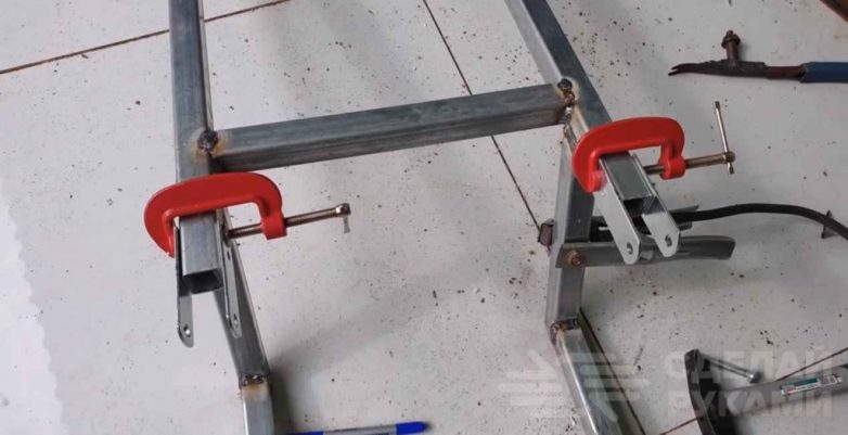 В первую очередь мастер отрезает кусок профильной трубы 25х25 мм, и вставляет по бокам два крепления для колес. После чего приваривает крепления к профилю.