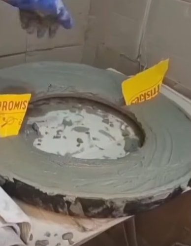 Разрезанную поперек автомобильную покрышку наполните цементом. Используя плотный картон, разделите основу из цемента пополам.