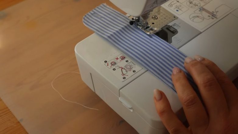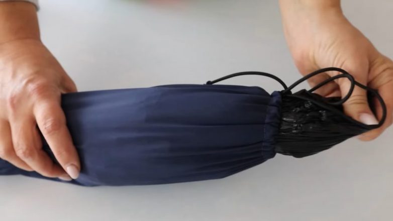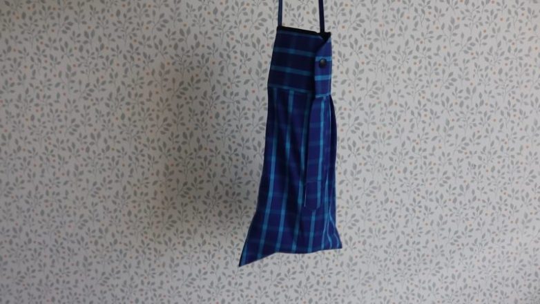 Второй интересной находкой может стать чехол для хранения пакетов. Для его пошива рукав обрежьте на произвольную длину, открытый срез дважды подверните, и прострочите, формируя кулиску. Оставьте незастроченным небольшой участок и вденьте в него шнурок или резинку.