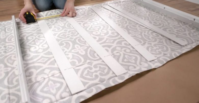 Положите ткань лицевой стороной на рабочую поверхность, сверху разложите жалюзи. Важно чтобы планки располагались на равном расстоянии друг от друга. Добавьте по 1 см снизу и по бокам и обрежьте плотную ткань.