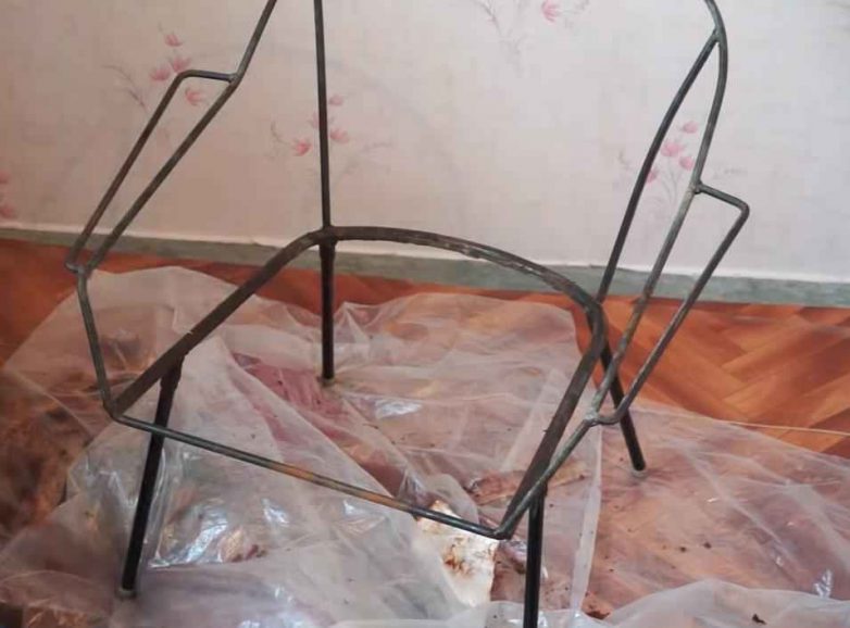 Первым делом необходимо удалить старые ремни, поролон и обшивку кресла, поскольку все это находится в очень плачевном состоянии. В итоге должен остаться только металлический каркас. Его нужно обработать растворителем, чтобы удалить остатки прилипшего поролона.
