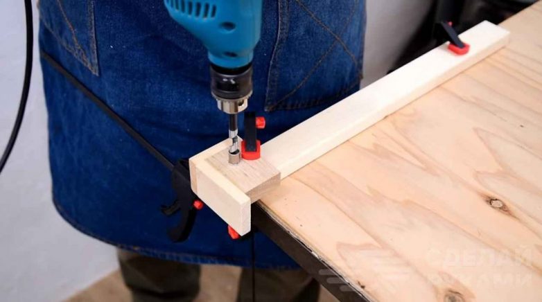 Если нет возможности достать деревянные бруски темного цвета (например, мореный граб, венге и др.), то можно просто воспользоваться краской нужного оттенка. В первую очередь нужно отпилить бруски по размеру. Потом по краям брусков сверлятся сквозные отверстия.