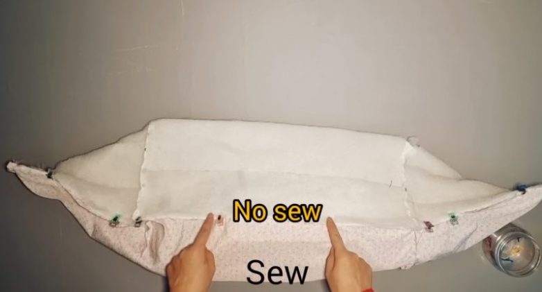 Заверните куртку внутрь и совместите нижние срезы. Сколите детали и прострочите их, оставляя небольшой участок для выворачивания.