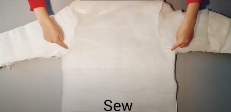 Продублируйте основную часть изделия утеплителем. Для этого наложите на подготовленные детали отрез утеплителя и простегайте ткань параллельными строчками на расстоянии 8-10 см друг от друга. Излишки утеплителя срежьте. Аналогично поступите с деталями рукавов.