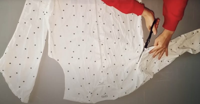 Подготовьте рубашку для работы. Для этого удалите воротник и укоротите изделие по низу примерно на 15 см. Обрежьте рукава.