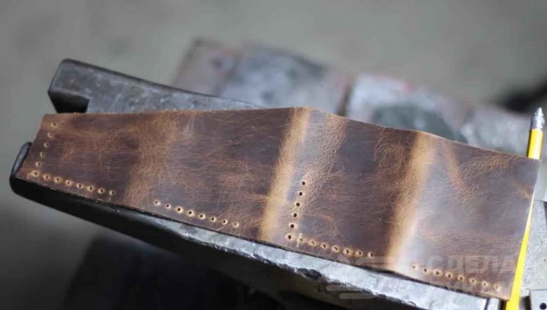 Далее в предварительно намеченных местах отрезка кожи нужно будет при помощи пробойника сделать отверстия, которые потом будут прошиваться ниткой.
