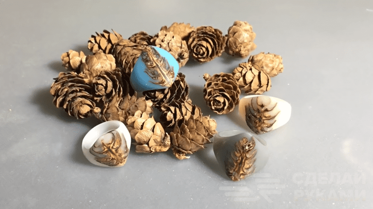 Подробно о том, как сделать своими руками красивые кольца из шишек и эпоксидной смолы, вы можете посмотреть в видеоролике на сайте.