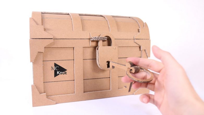 Картонный сундук, совсем как настоящий, с работающим замком и всё это из картона. Для сундука понадобится плотный картон, чтобы короб получился крепким, пара петель, термоклей.