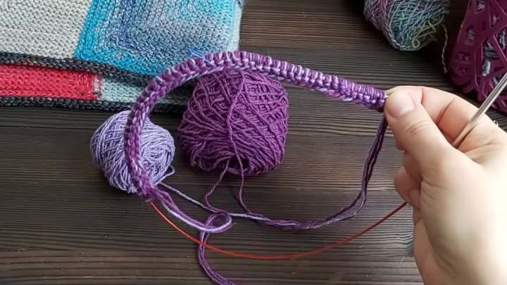 Если вы вяжете из пряжи разного качества и размера, то подобрать ниточки нужно так, чтобы они были плюс-минус одинаковой толщины. Можно вязать в две-три-четыре нитки. Спицы подберите на размер меньше, чтобы вязание было тугое, плотное. Количество петель для одного квадрата также может варьироваться, от вашего собственного желания. В данном МК используются спицы № 4, а плотность пряжи — для спиц № 5. Набор петель — 48. Посередине поставьте маркер — то есть, между 24+24 петлями.