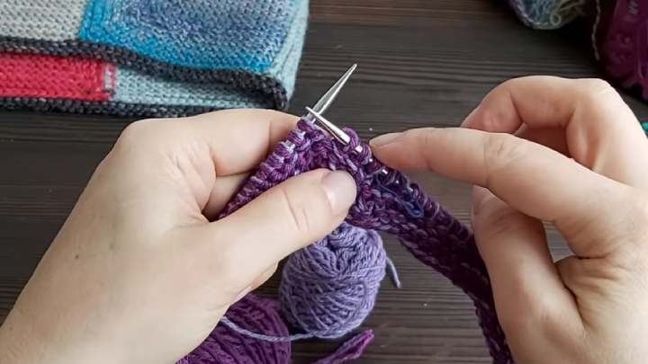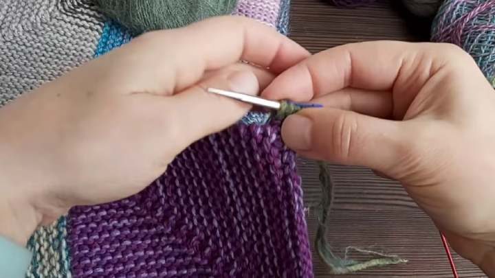 А теперь вяжите, как и ранее. В данном примере сторона изнаночная, поэтому убавок не будет. Следующий ряд — лицевая сторона, поэтому будут убавки возле маркера.
