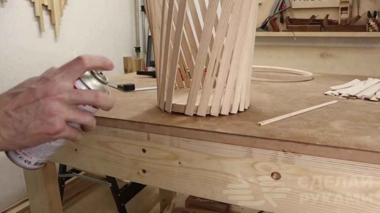 Далее автор клеит второй «слой» ламелей. В итоге получается переплетение фанерных полос. Смотрится очень красиво, хоть и просто.