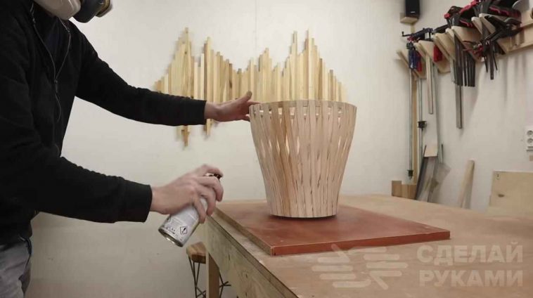 Потом останется сошлифовать выступающие части ламелей и покрыть готовое изделие лаком. Подробнее о том, как сделать плетеную мусорную корзину из фанеры, смотрите в видеоролике на нашем сайте.
