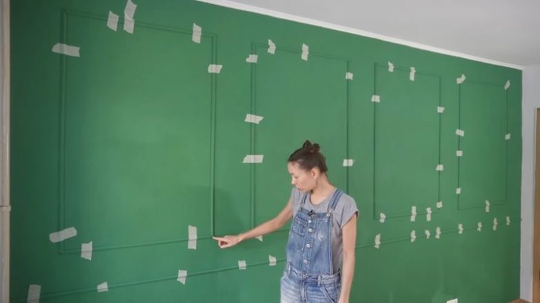 С помощью молдингов акцентную стену можно украсить следующим образом по схеме: Если между молдингами есть промежутки, их можно замазать шпаклёвкой, которую в дальнейшем также закрасить краской.