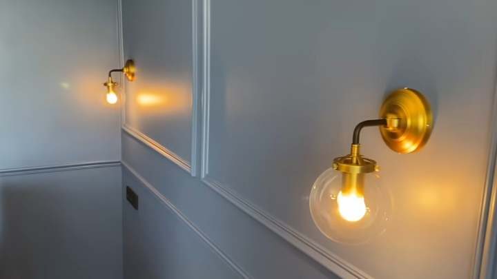 Старые обои хозяева решили убрать и поклеить новые — под покраску. Также наклеили молдинги в виде прямоугольных рам на одну стену. Поверх нанесли краску глубокого тёмно-синего цвета.