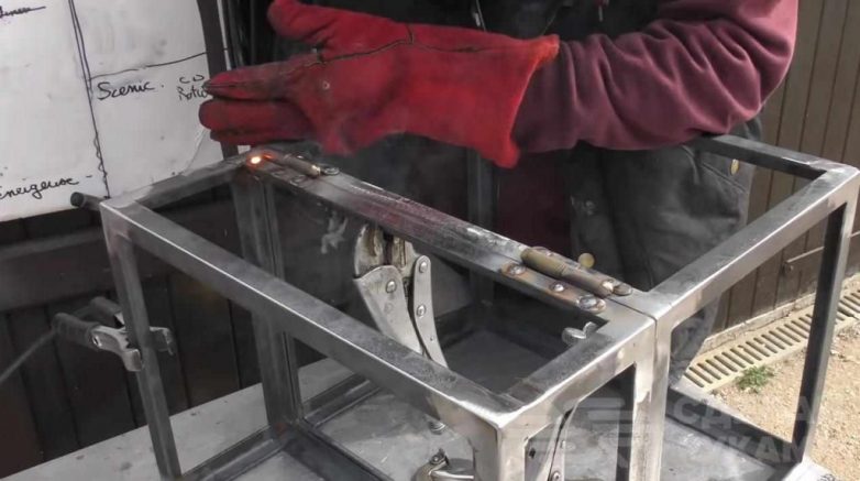 После этого два каркаса необходимо будет соединить вместе с помощью петель. На такой сундук достаточно пару штук. Места сварки надо будет зачистить болгаркой.