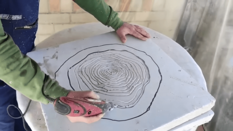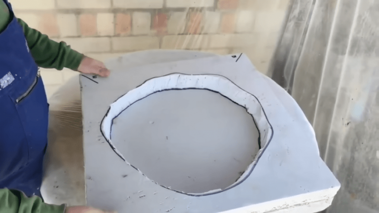 Для создания формы используем полистирол. При помощи маркера прорисовываем очертания спила. Делаем обрезку по контуру, а затем подравниваем края будущей формы. Подкладываем снизу еще один лист полистирола и намечаем контур.