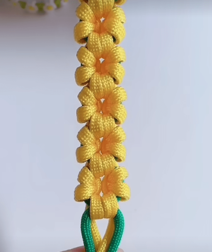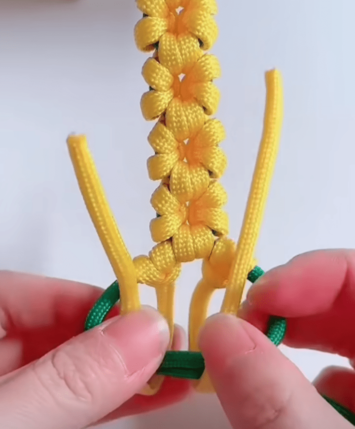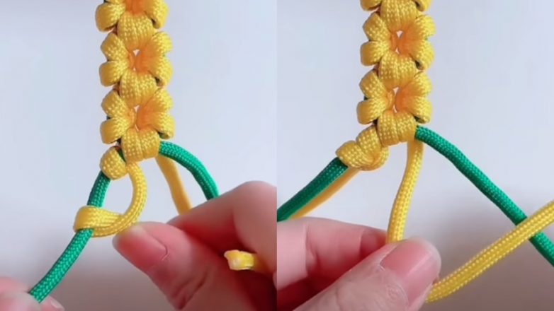 Задача заключается в том, чтобы создать по обе стороны основы по паре лепестков. По сути делаем по 2 витка с каждой стороны. Разница заключается лишь в том, что при создании первого витка желтый шнур проходит над зеленым и возвращается в полупетлю, а при создании второго наоборот. Именно за счет этого пара лепестков выглядит как птичка, скрепленная общим основанием.