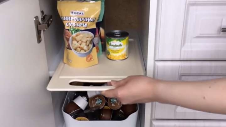 Старую разделочную доску также не спешите выбрасывать. Разложите на неё разные продукты в упаковках и отправьте в ящик на хранение. Теперь, чтобы достать продукт из самого дальнего угла, достаточно лишь выдвинуть доску, а не перебирать все продукты!