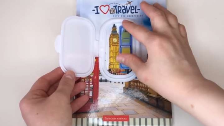 У влажных салфеток отклейте крышку. Её можно переклеить, например, на записную книжку, а внутрь вложить стикеры и скрепки.