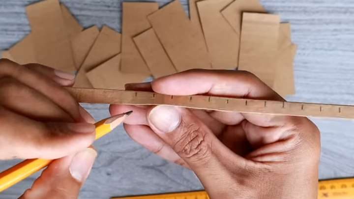Одинарный кусочек картона приклейте сверху, остальные двойные клейте попарно на расстоянии 1 см, по размеченной полоске.