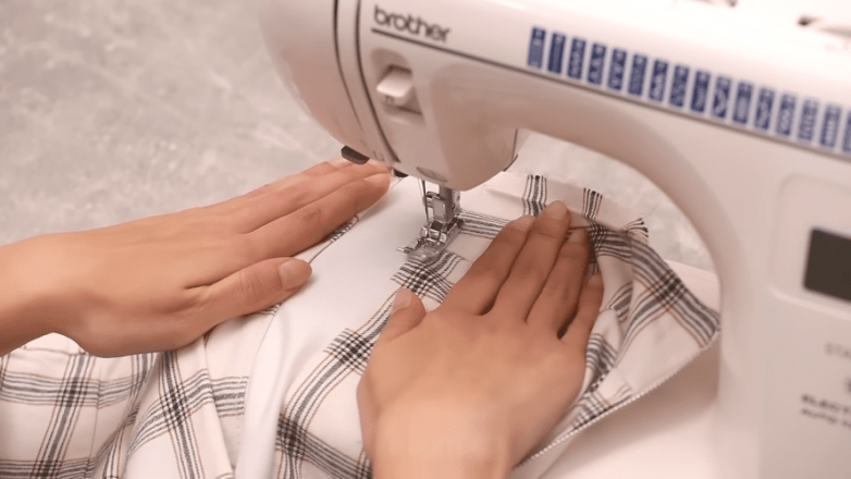 Подворачиваем резинку внутрь, сначала подшиваем края вдоль молнии, а затем прокладываем строчку вкруговую по нижнему краю.