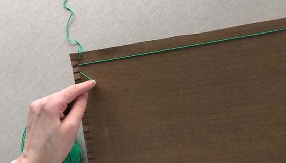 Теперь начинаем ее вплетать между натянутыми нитями на картоне. Оставляем небольшие концы не вплетенными.
