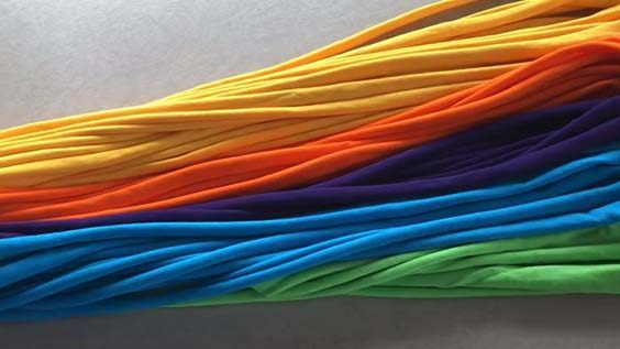 Разрежьте подготовленные изделия на полоски шириной 3-5-7 см (в зависимости от толщины материала, чем толще ткань, тем тоньше полоска). Разберите по цветам.