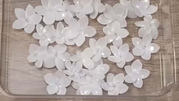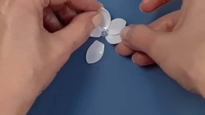 Нарежьте белую пластиковую бутылку на небольшие кусочки. Затем подрежьте их в форме лепестков. С помощью зажигалки сделайте края чуть загнутыми.