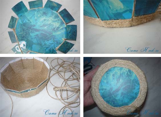 Конечно, можно просто взять любую картонную коробку и проложить по всему ее периметру джут. Но, как правило, такие предметы бывают квадратной формы.