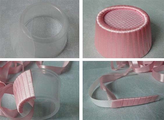 Смотрите – обычная пластиковая банка, немного атласных лент и клей в помощь! Какая в результате получается прелестная вещица!