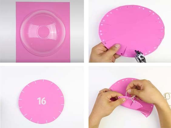 На круге сделайте 16 надсечек, проткните в каждом полученном сегменте по две дырочки. Если нет специального инструмента для этого, подойдет шило или портновская игла.