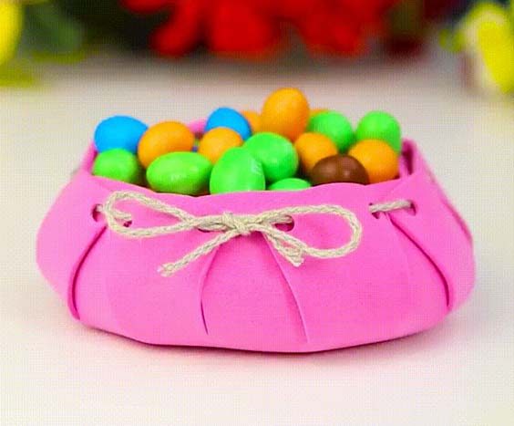 На посудине сделайте надрезы, согните получившиеся детали, придав форму корзинки, и склейте их друг с другом.