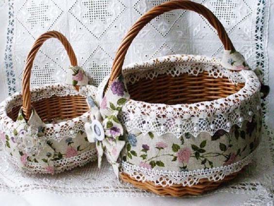 Самое простое, что можно сделать – украсить уже имеющуюся фабричную корзиночку тканью, кружевом, тесьмой, бантами. Уже будет презентабельный красивый вид.