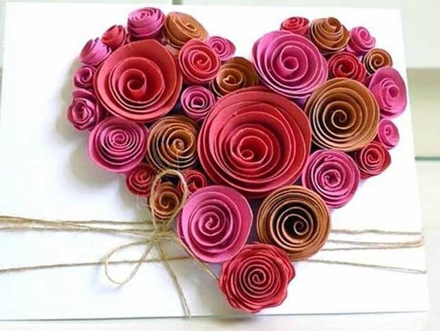 Если есть желание, накрутите из бумаги розочек. Эта работа в технике квиллинг удивит и порадует близкого вам человека.