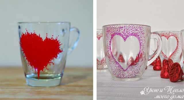 Банальные чашки тоже можно сделать оригинальным подарком, нарисовав на них сердечки.