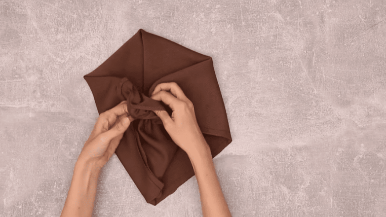 Поворачиваем получившийся прямоугольник короткой стороной к себе. Верхний левый угол подводим к нижнему правому. Придерживая ткань снизу, оказавшийся сбоку верхний правый угол заводим на нижний левый.