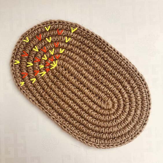 Набираем 14 вп джутовой нитью + петля подъема, поворачиваем и вяжем овал столбиками без накида за обе стенки косички по спирали (7 рядов), ввязывая канат.