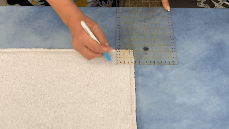 Откладываем по 4,5 см вглубь по углам состроченных полотенец и ставим пометки.