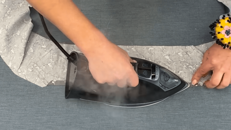 Задача заключается в том, чтобы сделать подгиб в 1 см по всему периметру с одной стороны состроченной детали. Постепенно расправляя полосу двигаемся по кругу, подгибая и заутюживая ткань. Полотно располагаем лицом вниз. Начинаем от угла.