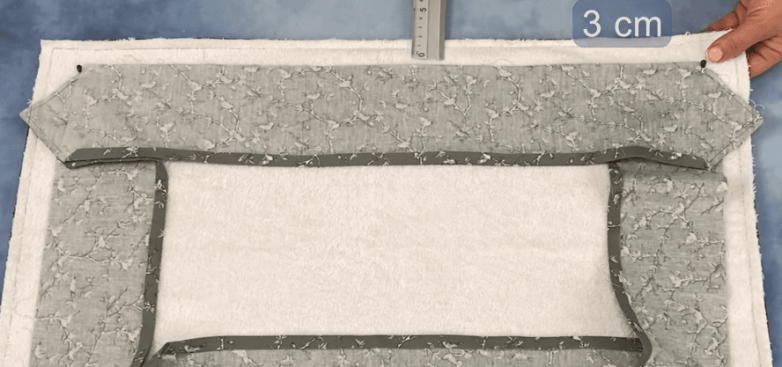 Каждую сторону отрабатываем отдельно. При этом важно, чтобы тканевая деталь имела отступ от края 3 см по всему периметру. Фиксируем ткань в углах. Закрепки делаем так, чтобы начало строчки соответствующего V- образного уголка совпадало с пометкой на полотенце. Затем расправляем ткань, дополнительно скрепляем посредине портновскими булавками.