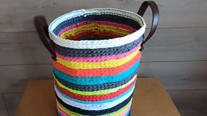 Мягкая, очень вместительная, яркая корзина, в которой удобно хранить вещи, детские игрушки, вязальные инструменты и вообще что угодно!
