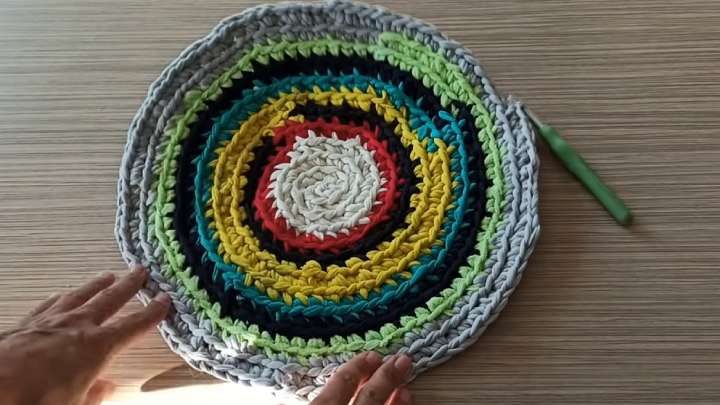 Теперь необходимо связать круг из остатков трикотажной пряжи.