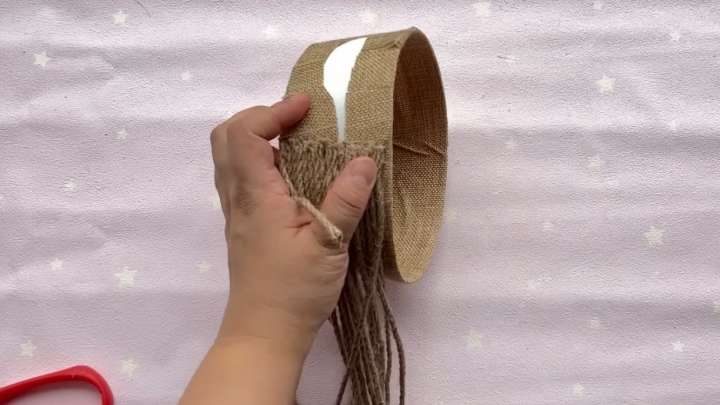 Обрежьте пластиковое ведёрко. Приклейте мешковину.