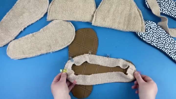 Сколите вместе с подошвой, прошейте, оставляя отверстие для вьетнамок.