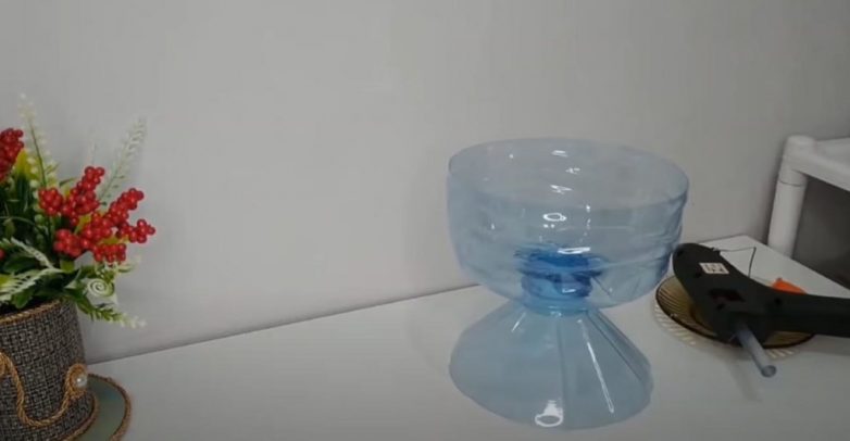 Из пятилитровой пластиковой бутылки также можно сделать декоративную вазу, которую можно использовать как для хранения свежих фруктов, так и для хранения еще чего-нибудь — например, печенья или конфет.Точно так же, как в первом случае, отрезаем верхнюю часть с горлышком и нижнюю часть баклажки. Склеиваем их вместе.