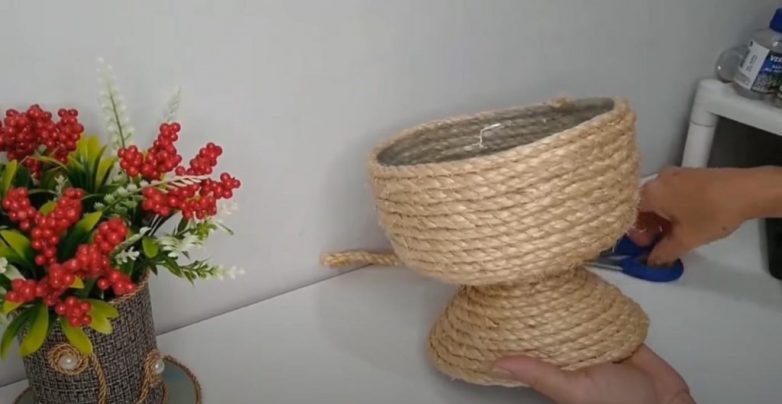 После этого берем веревку для рукоделия и обклеиваем самодельную вазу снаружи. Получилось дешево и сердито!