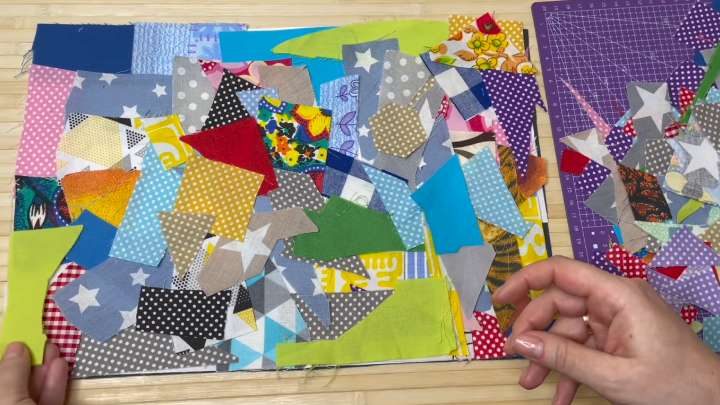 На плотную ткань разложите в 3-4 слоя мелкие обрезки разных размеров и цветов.