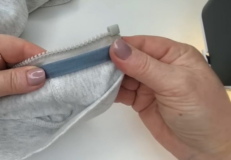 Подготовьте разъемную молнию, разделите ее на 2 части, приколите к толстовке и вшейте. Если не удалось подобрать молнию, строго соответствующую по длине толстовке, избыток в области горловины аккуратно срежьте, оставляя примерно 5 см.